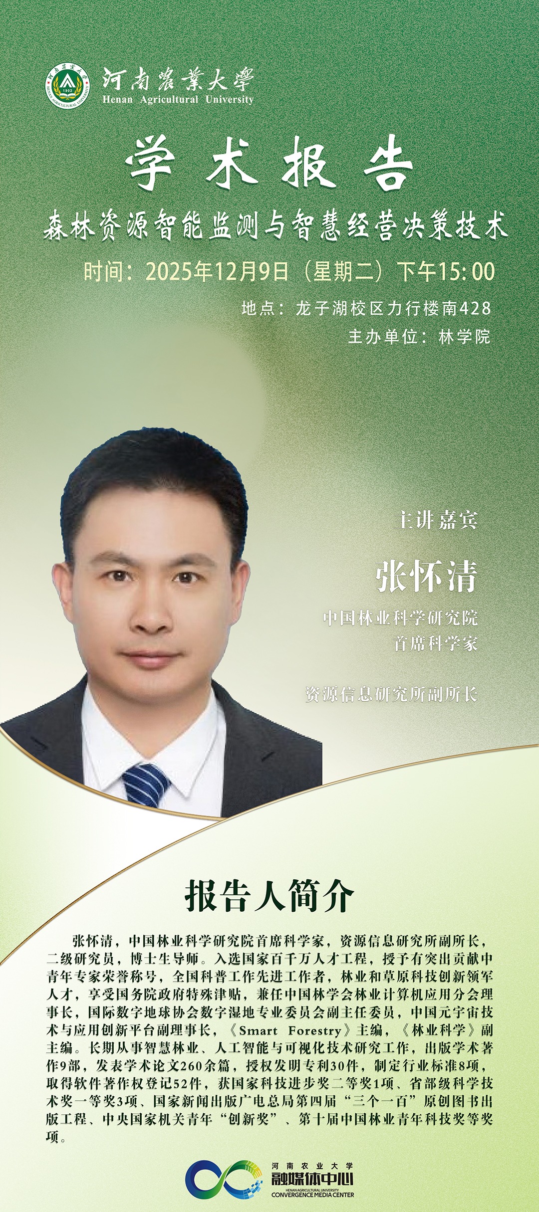 报告人: 张怀清报告题目:森林资源智能监测与智慧经营决策技术 报告时间:2025年12月9日15:30报告地点:力行楼2-南-428会议室个人简介:张怀清,中国林业科学研究院首席科学家,资源信息研究所副所长,二级研究员,博士生导师。入选国家百千万人才工程,授予有突出贡献中青年专家荣誉称号,全国科普工作先进工作者,林业和草原科技创新领军人才,享受国务院政府特殊津贴,兼任中国林学会林业计算机应用分会理事长,国际数字...