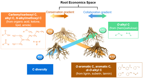 研究团队采集了66种热带树木的细根样本,利用13C核磁共振(NMR)分析,量化了细根中来源于不同化合物不同官能团的碳组分相对丰度,首次报道了植物根系分子水平碳性状的变异格局,揭示了这种分子水平碳性状在塑造细根多维经济空间中的重要作用(图1)。全球尺度的数据分析表明分子水平碳性状与细根多维经济空间之间的耦合可能是一个普遍现象。这一发现不仅为理解植物根系形态和功能的多样性提供了全新的分子尺度的见解,而且对于理解植物进化、物种共存以及对异质环境的适应性等方面具有重要意义。