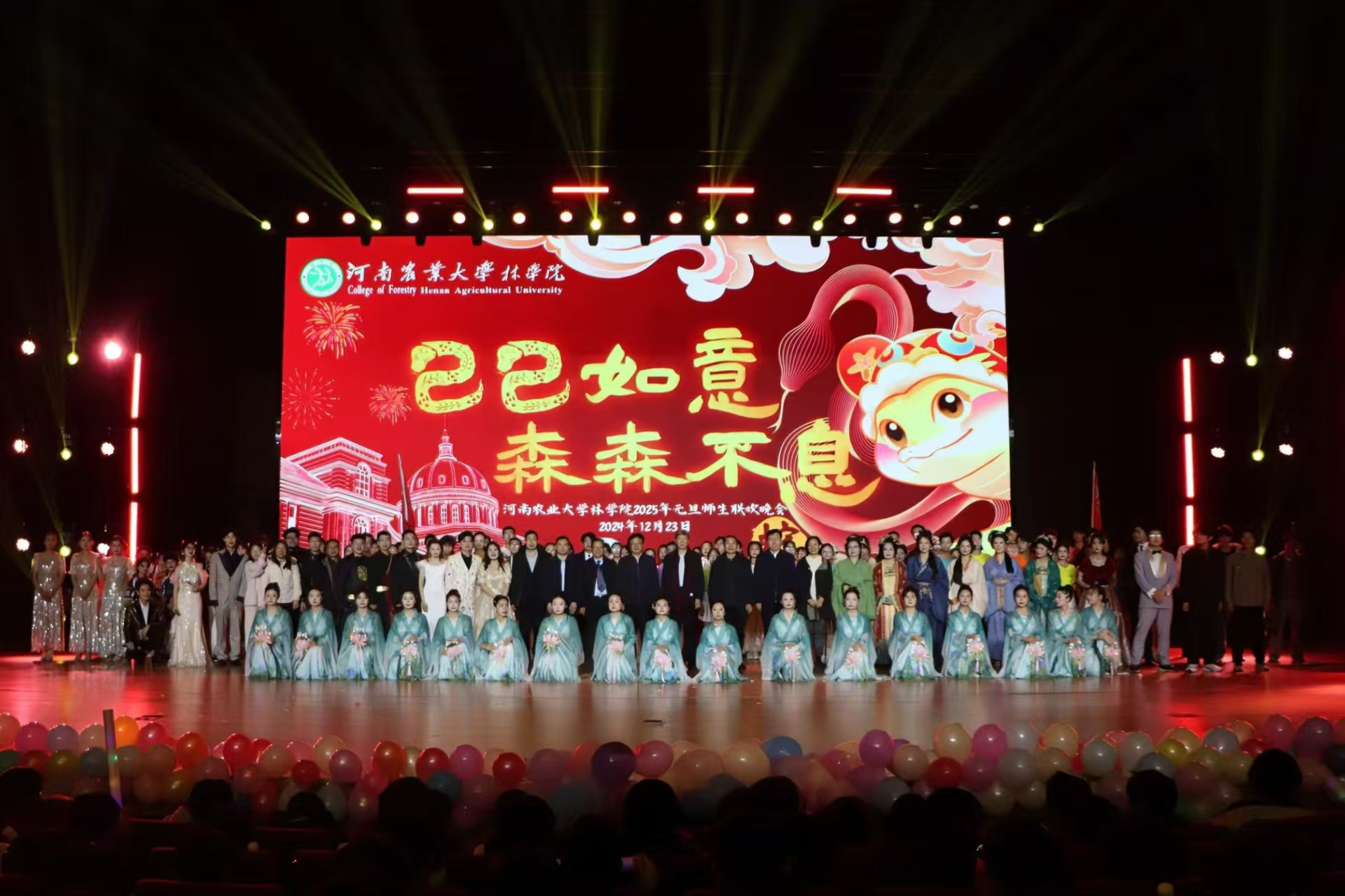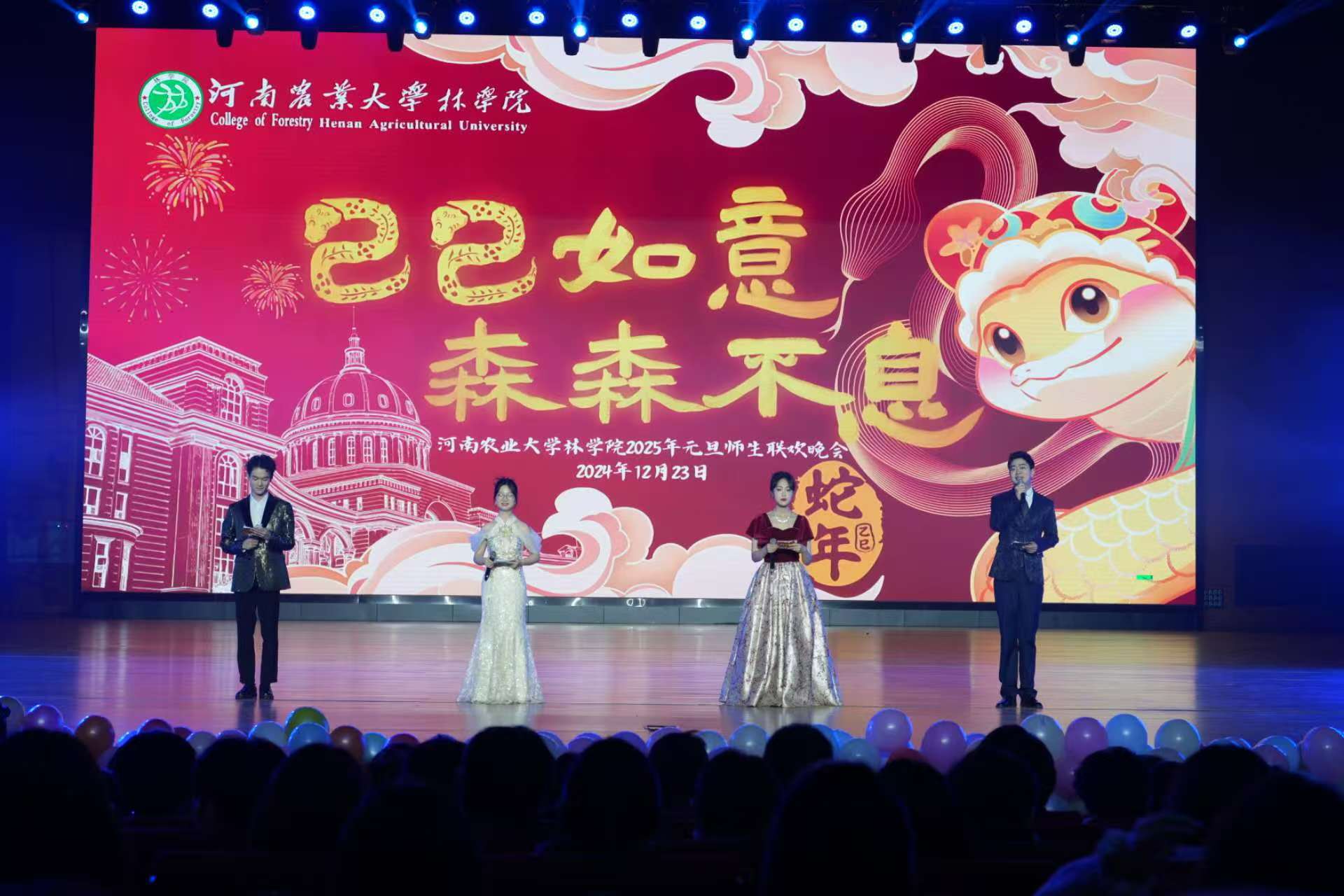 2025年元旦师生联欢晚会于龙子湖校区英林讲堂隆重举行。副校长杨喜田、校党委宣传部部长邓振营、校党委学工部部长徐峰、校招生就业办公室主任张红阳、校党委保卫部部长刘全军、校团委书记贾云飞、校工会副主席董晓莉、校党委办公室副主任张保磊、校党委统战部副部长蒋春红、校党委学工部副部长王玲、H动画