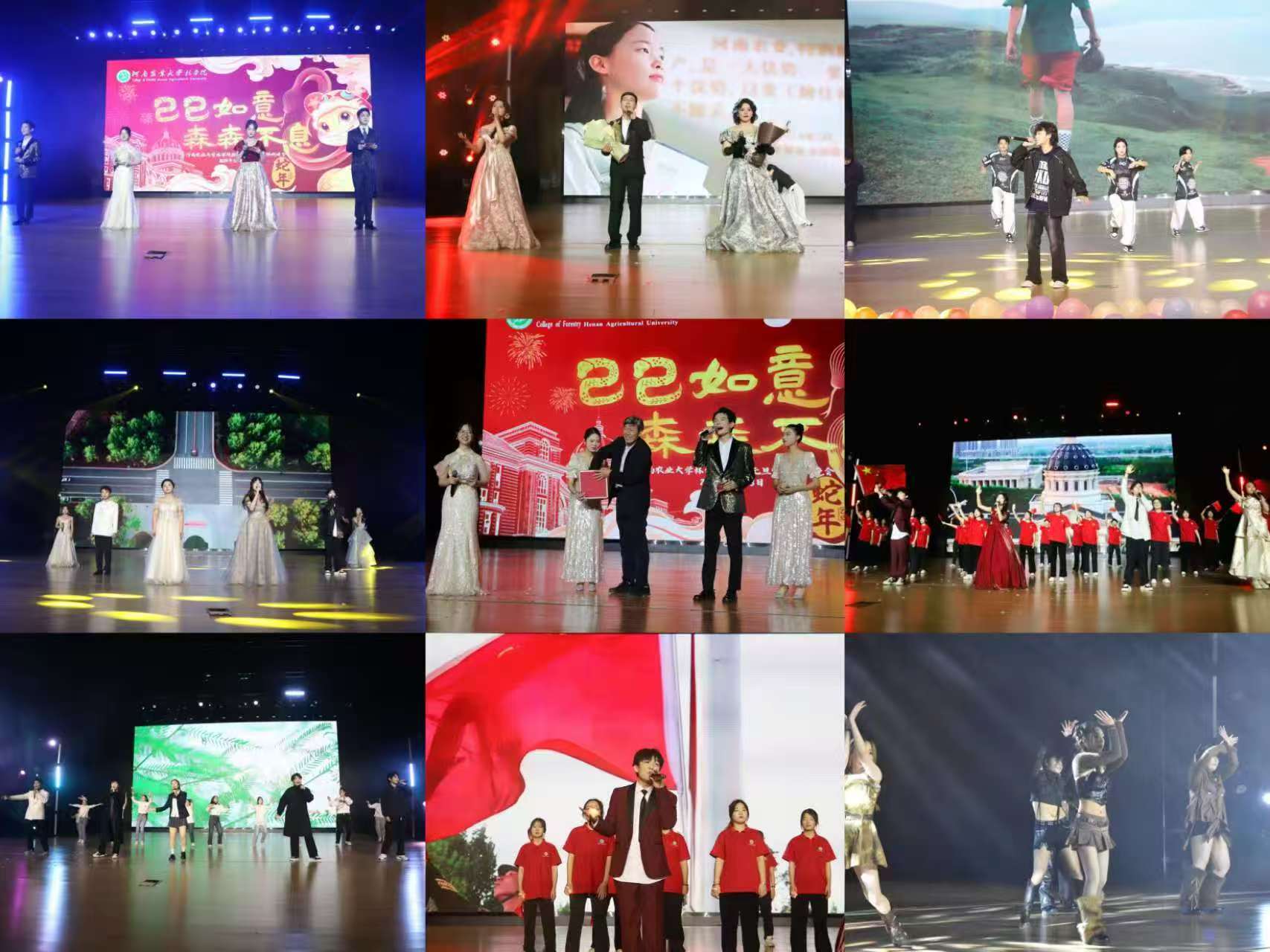 随后,演出在开场舞《我们一起闯》中拉开序幕,舞者们活力四射点燃全场。本次晚会共分为“森之忆”、“林之韵”、“新之耀”三个篇章。歌曲《归途有风》、《飘向北方》、《你的模样》、《Forever Young》蕴含着对远方的渴望和对理想的追求,激励大家在新的一年里勇敢地追寻自己的目标,无畏前行;现代舞《Helicopter》以充满力量与节奏感的舞姿,展现青春的活力与激情;歌舞合唱《寄明月》、走秀节目《古韵今风》,为观众带来古风典雅与时尚潮流相结合的视觉盛宴;小品《分工明确》紧跟时代潮流,以幽默诙谐的方式调侃当下热门社会现象;H动画