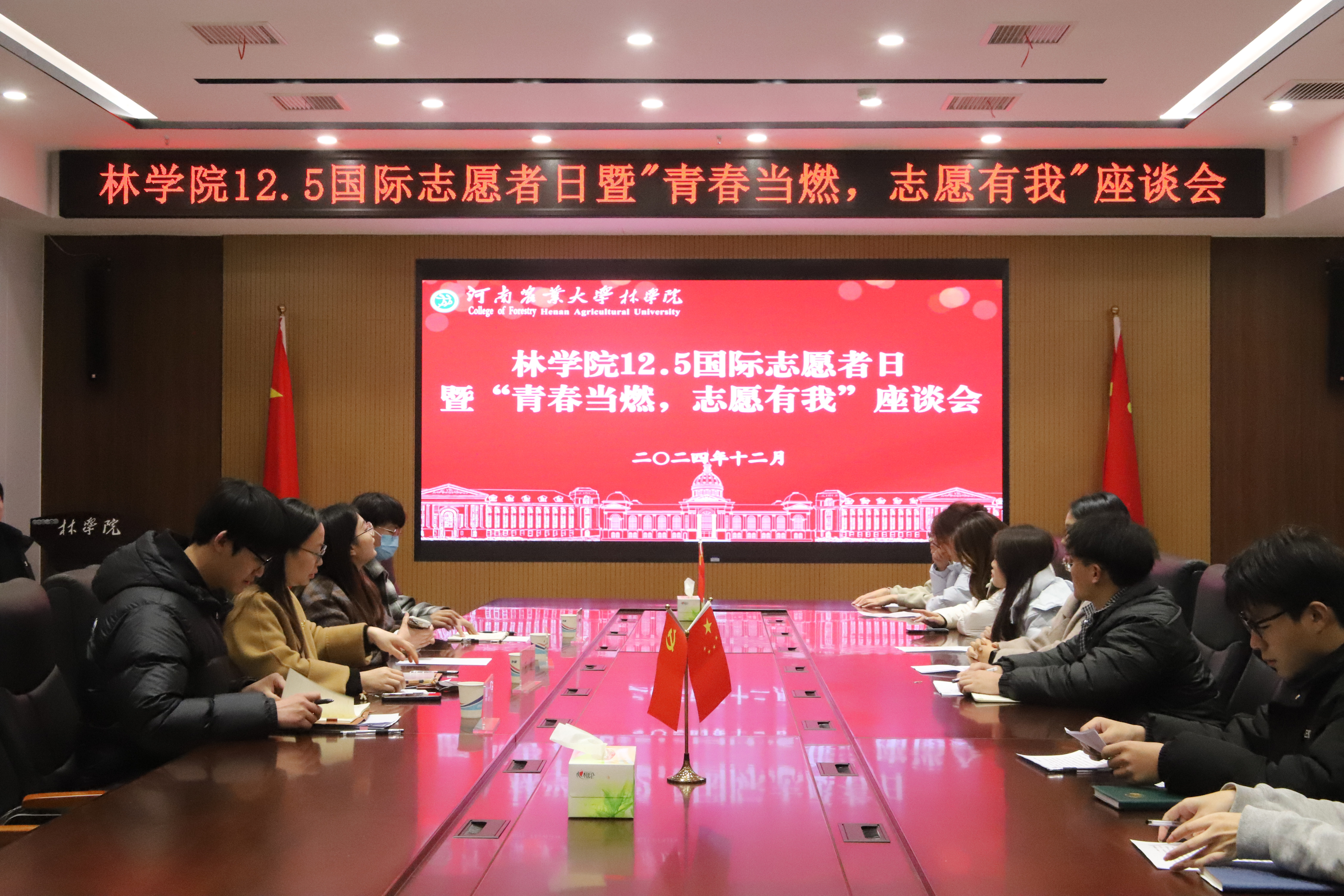 12月5日,H动画 于龙子湖校区力行楼南231会议室召开12.5国际志愿者日暨“青春当燃,志愿有我”座谈会。院党委副书记王娟、院团委书记田原、院团委老师马蒙恩、饶杭出席本次座谈会,学院各社团代表、志愿者代表参加本次座谈会。