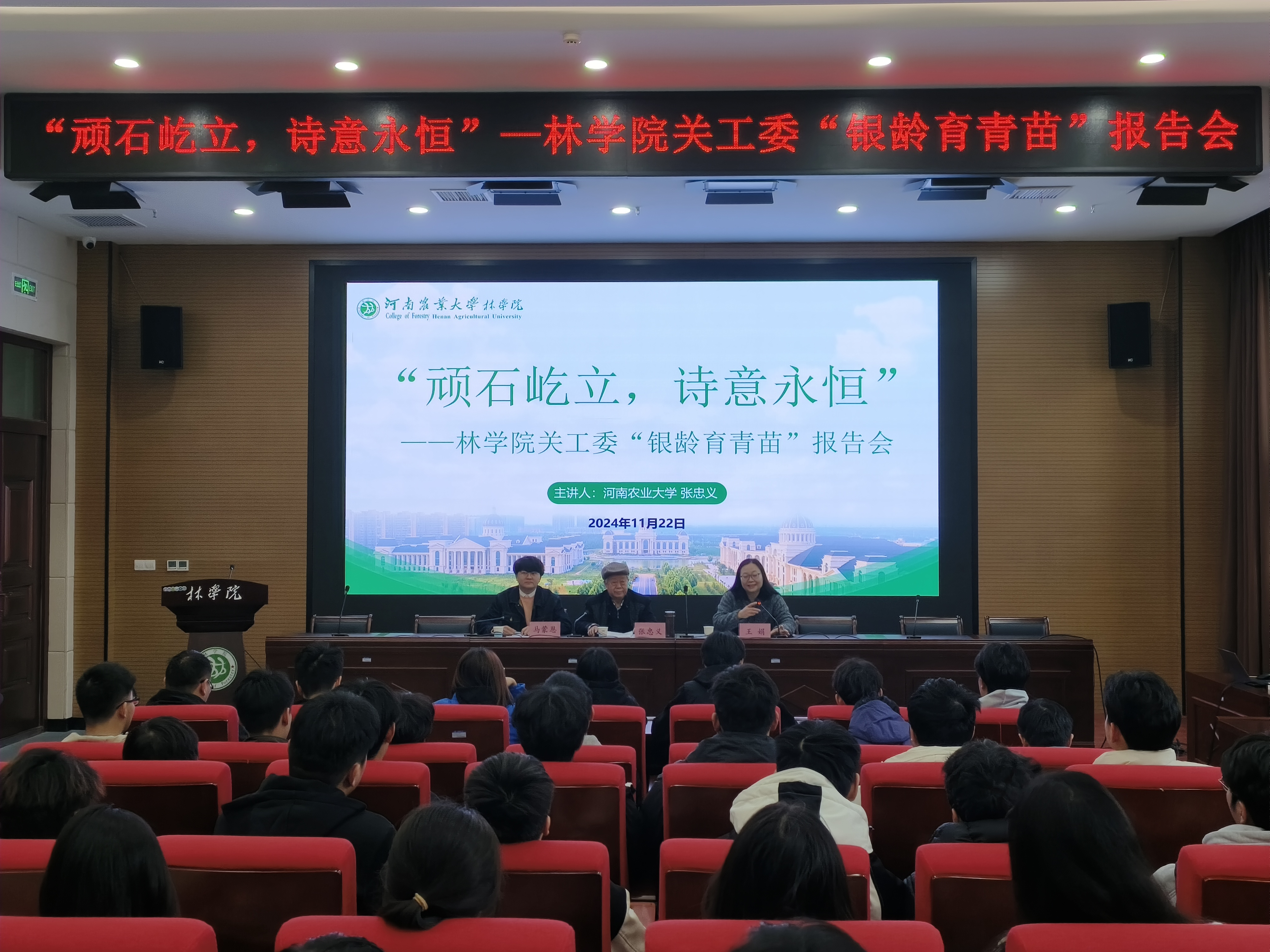 11月22日,H动画 在力行楼南428举行“银龄育青苗”报告会,本次报告会邀请关工委品牌创建与社团指导员张忠义教授担任主讲人,院党委副书记王娟,院团委老师马蒙恩参加此次会议。