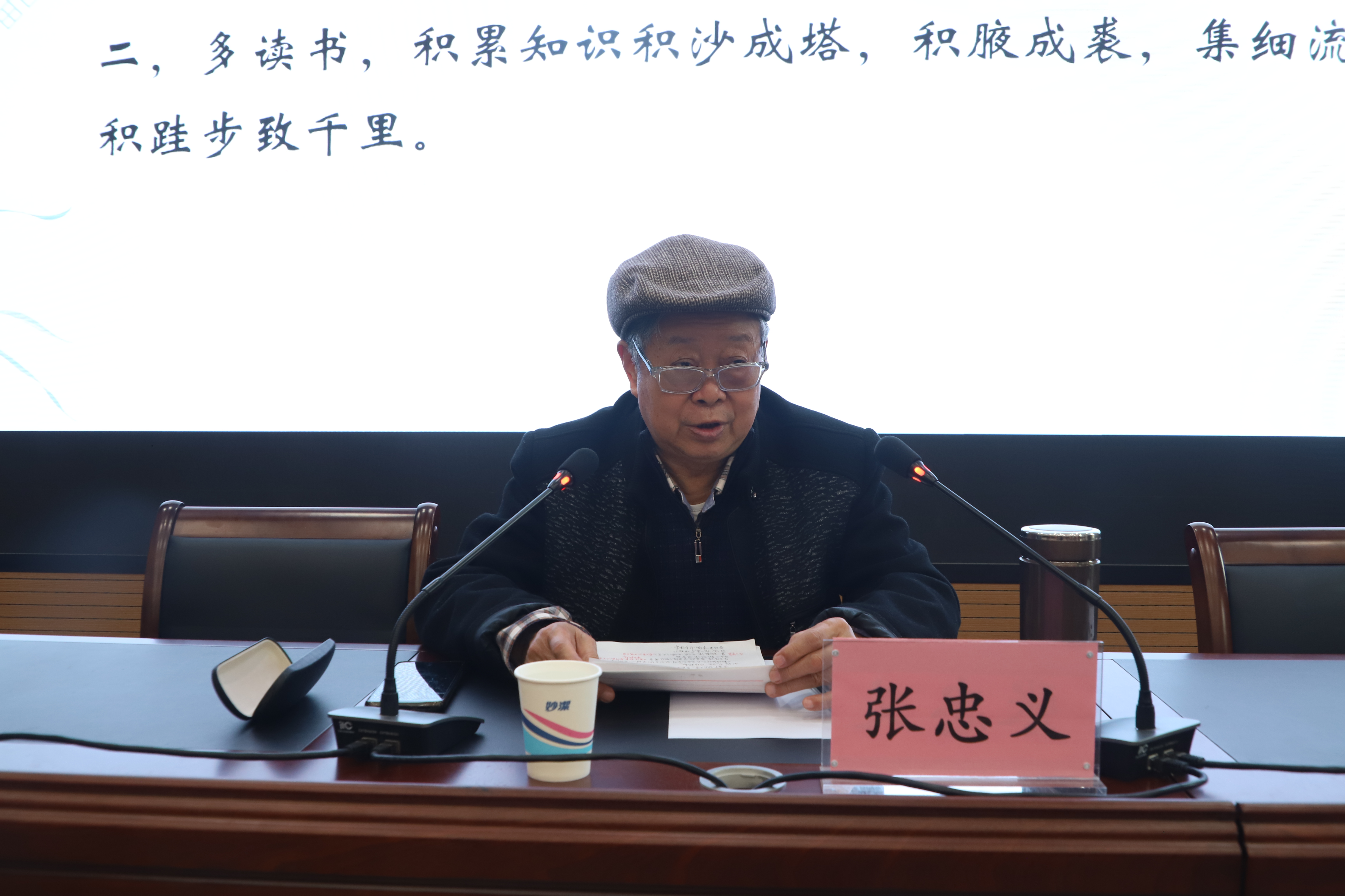 会议伊始,张忠义教授以自身经历为切入点,鼓舞同学们在面对当下学习与生活中的挑战时,要坚守初心,勇往直前,莫要轻言放弃。随后,张教授向同学们分享了他自己所喜爱的经典诗作,并介绍了自己创作的诗歌,希望同学们也能怀着对诗歌创作的浓厚兴趣与热情,传承中华优秀传统文化,努力学习,积极进取,为实现个人价值和中华民族伟大复兴贡献自己的力量。