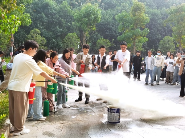在消防演练中,师生在教员、保卫处工作人员指导下进行了实际操作,真实体验了灭火和逃生过程,按照火场逃生知识迅速从“火场”有序撤离至安全区域。