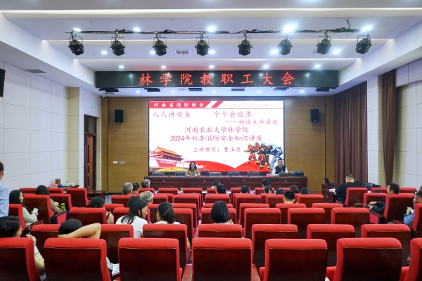 河南省消防协会曹玉臣教员做《人人讲安全、个个会应急——畅通生命通道》专题讲座。他用直观的火灾事故案例进行警示教育,详细讲解了火灾预防、火场逃生、灭火器材使用等基本知识。