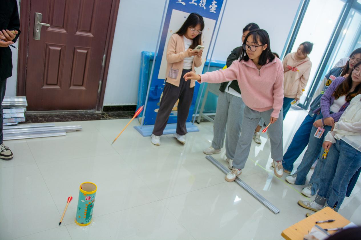 游园会由五⼦乒乓、堂上投壶、沙场点兵、动物跳跳乐等多个活动环节组成。五子乒乓赛场上球飞如电、技艺高超,同学们展现出了过人的球技和敏捷的反应能力;堂上投壶环节,风起云涌、精准投送令人紧张不已;沙场点兵环节,同学们通过协作和策略的运用,展示了团队合作的重要性…..丰富多彩的活动吸引了学院师生们积极参与,营造了良好节庆氛围,为师生们带来了丰富多彩的校园文化生活。