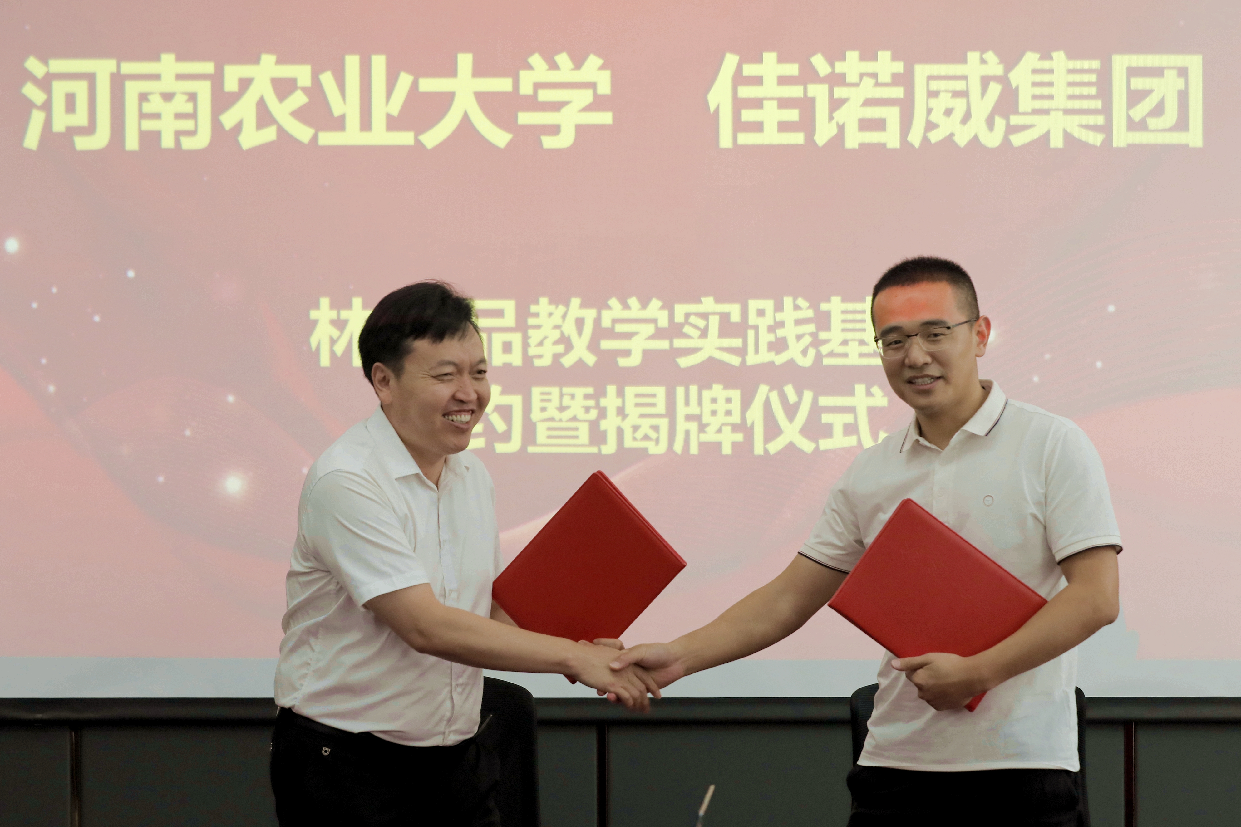 党委书记化青报同志与佳诺威集团股份有限公司董事会秘书李飞同志签署了林产品实践教学基地协议。