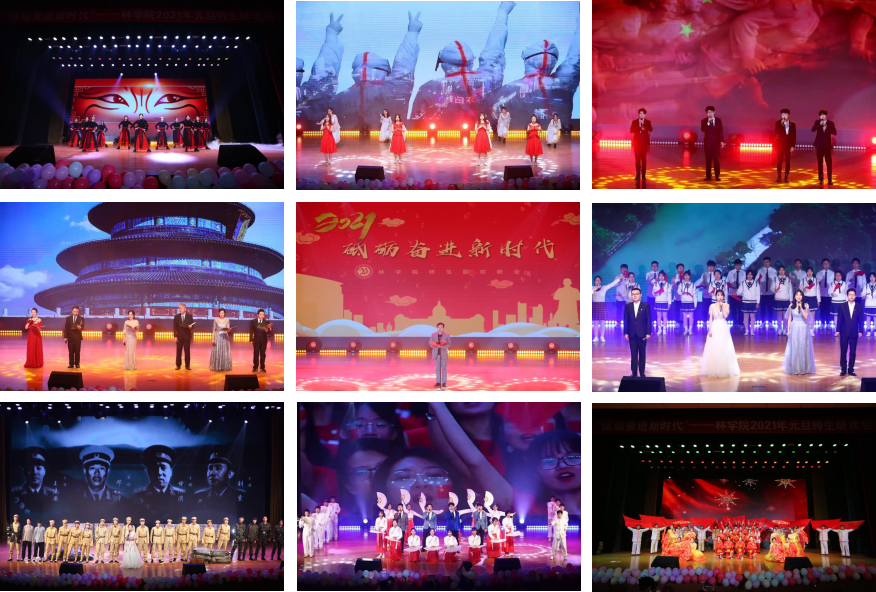 号角奏响,盛世华章,晚会在喜庆欢乐的舞蹈《盛世欢歌》中拉开了序幕。歌曲《祖国》让现场观众热血沸腾,深深地为祖国的繁荣富强而感到自豪;情景剧《英雄儿女》生动形象地展现了中国人民志愿军奔赴朝鲜战场,不畏牺牲,抛头颅洒热血的英雄气概;歌伴舞《少年中国说》展示了H动画 学子弘农爱国,奋发进取的青春风貌;诗朗诵《砥砺奋进新时代》赞颂了大国盛世,表达了林院教职工砥砺奋进新时代的决心和信心;小品《乌龙快递》以诙谐的语言向抗疫英雄致敬,引起现场观众的共鸣;歌曲《强国一代有我在》表达出重任在肩,共同开创辉煌未来的少年担当和责任。歌曲《平凡之路》、相声《我要幸福》、舞蹈《洛水佼人》、《时韵花旦》、《用尽我的一切奔向你》先后登台,节目激情飞扬,别出心裁,让现场沸腾不已;晚会在歌曲《赞赞新时代》中拉下帷幕。