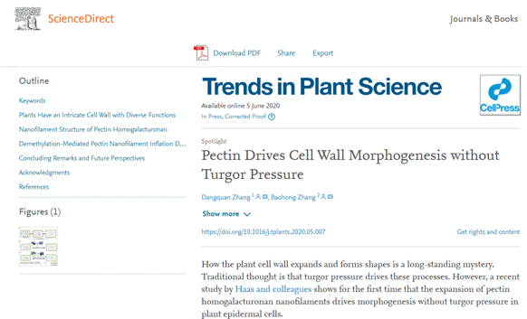 张党权教授在国际著名综述期刊Trends in Plant Science(植物科学趋势)在线发表高水平焦点论文《果胶无膨压促进细胞壁形态发生》(Pectin Drives Cell Wall Morphogenesis without Turgor Pressure)。Trends in Plant Science由Cell出版集团主办,是有重要影响力的学术期刊。H动画