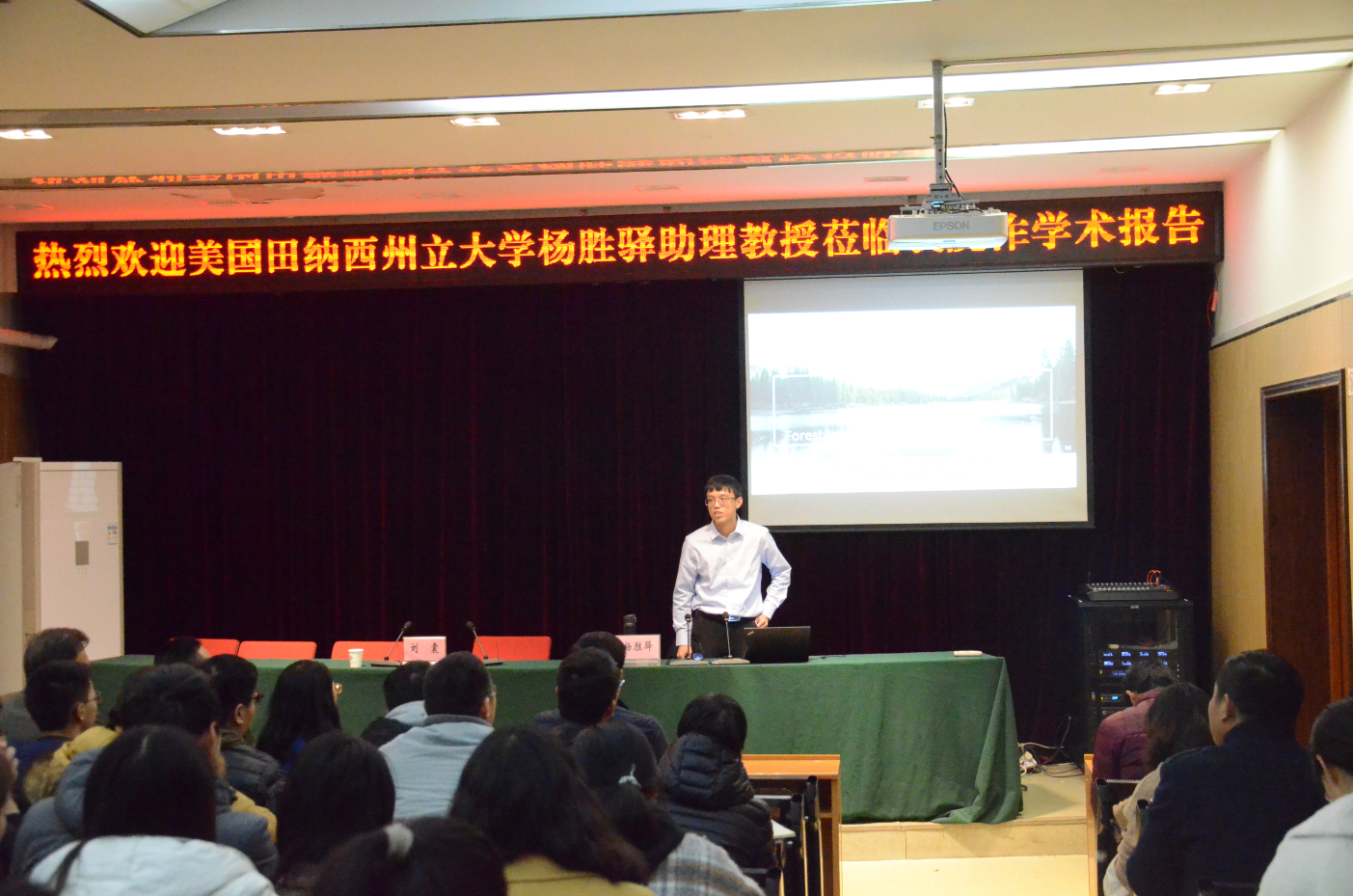 杨胜驿以《森林资源调查方法与林木生长预测 (Sampling Methods for Forest Inventories and Growth Projections)》为题,介绍了美国森林分布的现状、美国南方松的经营和资源调查方法、建立林木生长模型时如何抽取样片以及如何将获得的新数据应用到模型中并对其进行修正等有关内容,给师现场生留下了深刻的印象。