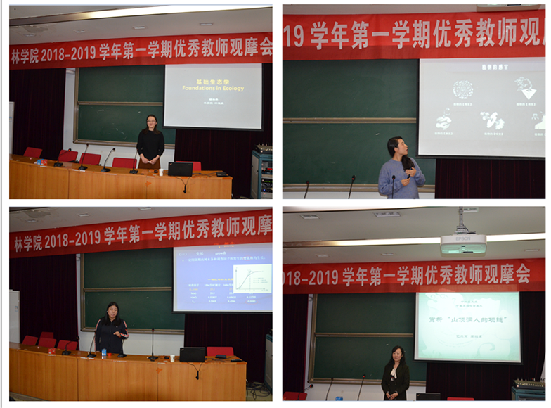 近年在学校讲课大赛获得佳绩的林学系郭芳、园林系石力匀、环境系顾海萍和艺术系李琪曼等四位老师授课示范。顾海萍从大家熟悉的童话《爱丽丝梦游仙境》片段阐述了“红皇后”假说起源,切入到生物进化,物种竞争。课程设计新颖,论述精辟,带入感强,课堂氛围融洽。郭芳讲授了《测树学》中的“树木生长量测定”,凭借着深厚的教学功底,深入浅出地将树木生长量测定的概念、分类和计算进行讲解,节奏迟缓有度,声情并茂,将晦涩难懂的学术概念讲授得通俗易懂。石力匀讲授了《观赏植物学》中的“植物的感官”,精美的课件制作,生动的讲课方式,调动听众的学习兴趣和积极性,课堂气氛活跃。李琪曼讲授了《中国原始社会美术》中的 “山顶洞人的项链”,从提问式开始,教学思路清晰,结构严谨,环环相扣,整个课堂如涓涓流水。