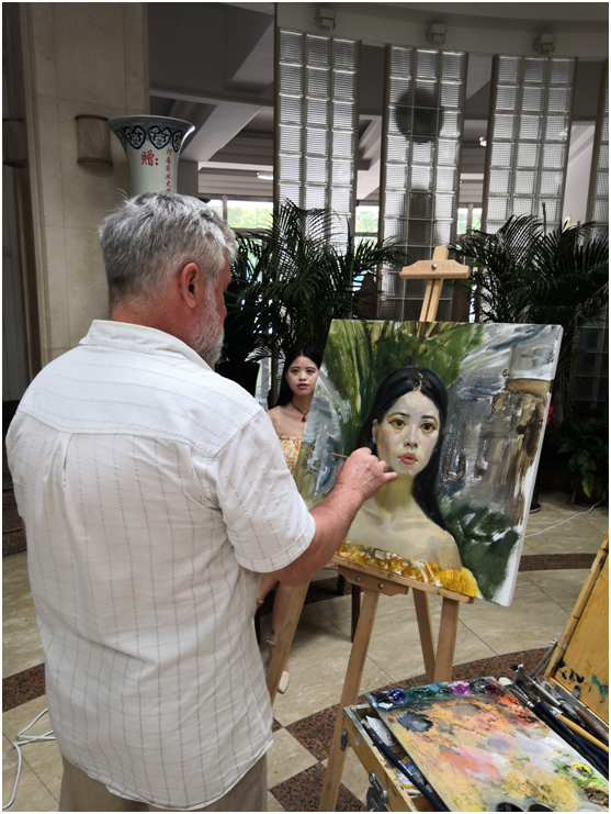 9月3日上午,俄罗斯功勋艺术家亚历山大·伊万诺夫带领列宾美院三名学生在三百人报告厅天光休息区为H动画
