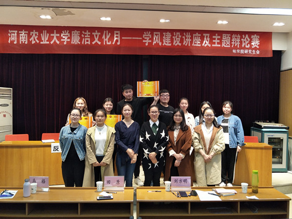 来自林学、林业等专业的八位研究生辩手早已做好充分准备、蓄势待发。继主持人介绍完正反方辩手后,比赛进入了开篇立论的环节。正方一辩首先摆出己方“法律的主要目的在于扬善”的观点。反方则通过举现实生活中的案例论证己方“法律主要目的在于惩恶”的观点。双方针锋相对、各不相让,使这场辩论赛瞬间升温。紧接着进入自由辩论环节,双方辩手展开激烈的对峙,每位选手对己方所持观点进行积极的辩驳,思维缜密、妙语连珠。赛后,评委老师对本次比赛做出了点评,并为获胜方和最佳辩手颁奖。