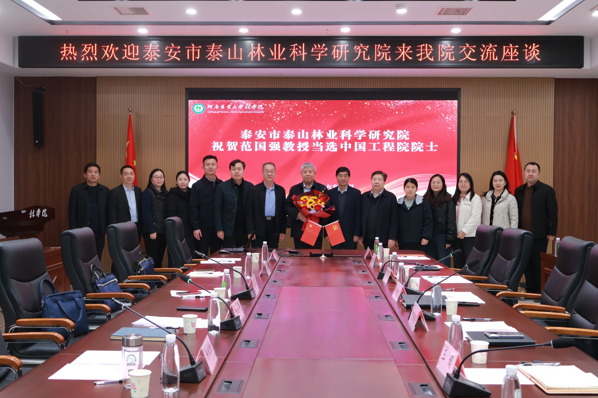 会议伊始,化青报对张德涛一行的到来表示欢迎,并介绍参会领导与嘉宾。随后,泰山林科院向中国工程院院士范国强敬花。