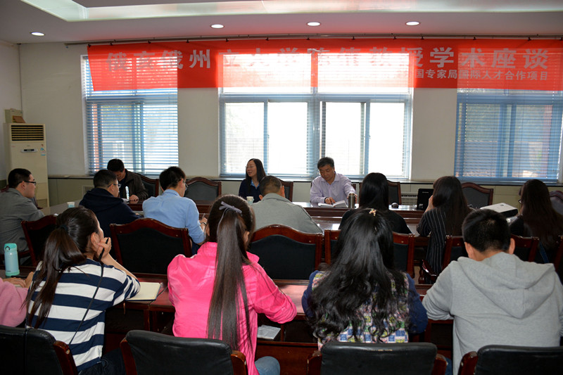 会议室,陈倩教授与风景园林学教师及研究生开展座谈,院长杨喜田参加了交流会,会议由田国行教授主持。陈教授基于绿色基础设施及其可持续发展的研究,强调当下建设资源节约型、环境友好型社会的重要性,并分享了在应用高效、节能、低碳、环保新材料领域研究的心得,针对高速公路边坡生态植被恢复、城市绿地系统规划等研究课题给予充分指导。
